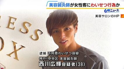 不同意わいせつの疑いで逮捕されたのは、「サクセスボックス神戸元町店」代表で美容鍼灸師の西川広輝容疑者(38)=神戸市中央区=です。
