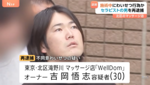 北区滝野川のマッサージ店「WellDom」経営者の吉岡悟志容疑者(30)はことし10月、自身が経営する東京・北区のリラクセーション店で、20代の女性にわいせつな行為をした疑いがもたれています。