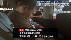 埼玉県警鴻巣署地域課警部補の岡田英之が警察のシステムで知人男性の個人情報を入手して男性と妻から現金を脅し取ろうとしたとして逮捕。