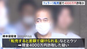 牛込署によると、逮捕容疑は2020年10月ごろ、東京都新宿区の50代女性に「フェラーリを買えば、1億円以上で売れる」とうその転売の話を持ちかけ、車の購入代金として4千万円をだまし取ったというもの。