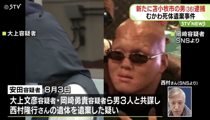 会社役員の大上文彦容疑者(49)=白石区=と渡辺斉容疑者(68)と斉藤朋世容疑者(52)と会社員の梅津悠希容疑者(36)=苫小牧市=と会社員の岡崎勇貴容疑者(37)=苫小牧市=と自営業の安田和輝容疑者(36)=苫小牧市泉町2丁目=が西村隆行さん(55)を殺害してむかわ町の山林に遺棄したとして逮捕されました。
