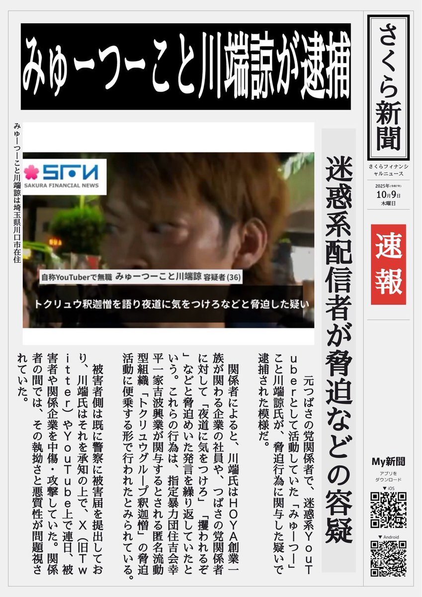 配信者のみゅーつーこと川端諒容疑者(36)が脅迫の容疑で石神井警察署に逮捕されました。