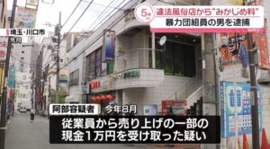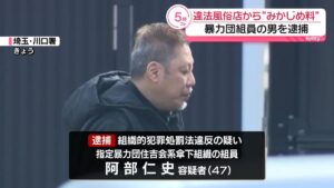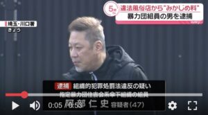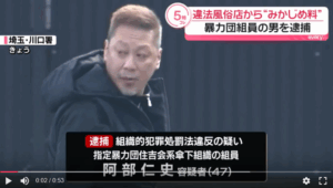 住吉会武州前川一家金田会本部長の阿部仁史が店舗型韓国サウナ「グリーンサウナ」からみかじめ料を受け取ったとして逮捕。