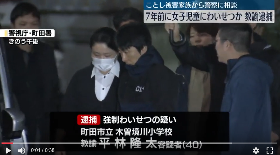 町田市立木曽境川小学校教師の平林隆太が女子児童にわいせつ行為をしたとして逮捕。