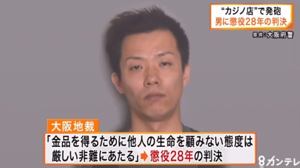 韓国籍の井川眞一こと姜真一容疑者(34)がミナミのインターネットカジノ店で従業員の男性ら2人に発砲して大けがを負わせたとして大阪地裁で懲役28年の判決を言い渡されました。