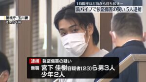 東京都千代田区内の路上で男性2人が鉄パイプで殴られ負傷した事件で、警視庁国際犯罪対策課は21日までに、強盗傷害容疑で、無職の宮下佳樹(23)=大阪府八尾市山本町北、解体工の大谷真那斗(21)=札幌市白石区菊水八条=と解体工の藤井雄斗容疑者(22)=同市中央区南八条西=、無職の少年(19)=京都府福知山市=ら5人を逮捕した。