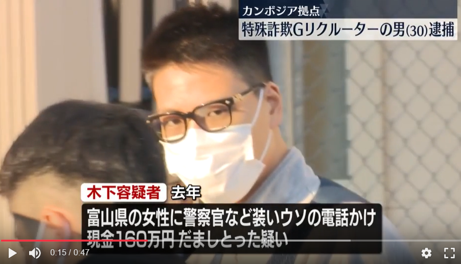 木下真介が特殊詐欺グループの勧誘を行っていたとして逮捕。