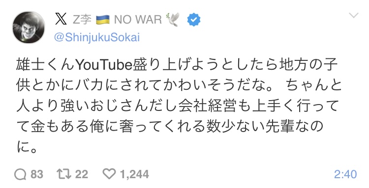 田中雄士はツイッターやユーチューブなどでZ李と仲が良いということを言っていました。