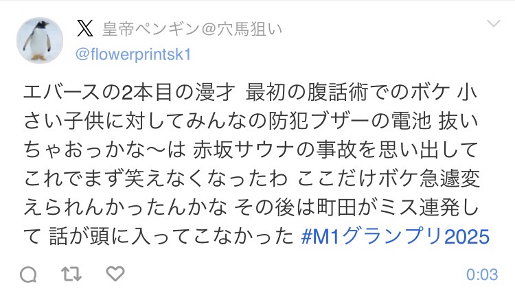 エバースはM1グランプリの決勝で子供の持っている防犯ブザーの電池を抜いて電源が入らないようにするというネタをやりました。