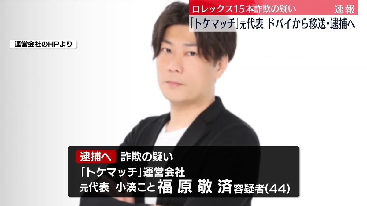 高級腕時計シェアリングサービス「トケマッチ」を巡り、所有者から預かる名目で時計をだまし取ったとして、警視庁捜査2課は26日、詐欺容疑で、逃亡先のアラブ首長国連邦(UAE)から帰国した運営会社「ネオリバース」(大阪市中央区、解散)元代表で住所、職業不詳の小湊こと福原敬済容疑者(44)=国際手配=と同社元社員の中山大志容疑者(44)=大阪市平野区瓜破西=ら2人を逮捕した。