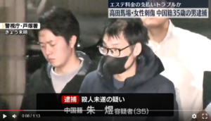 中国籍の朱煜が高田馬場でエステ店の店長の女性を刃物で刺したとして逮捕。