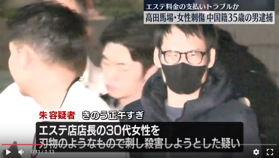 中国籍の朱煜が高田馬場でエステ店の店長の女性を刃物で刺したとして逮捕。