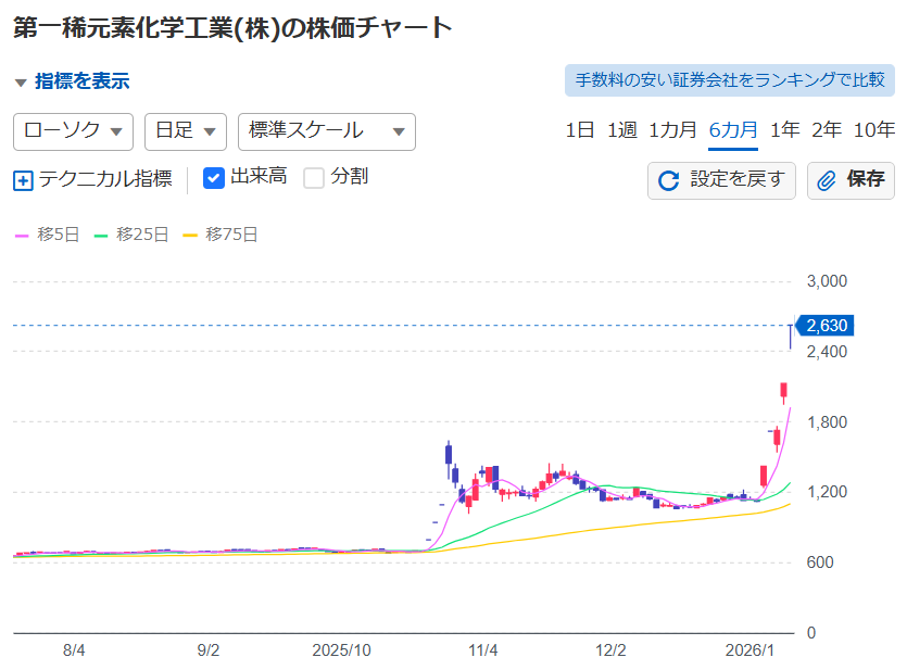 第一稀元素化学工業は株価が10月から4倍以上になっています。