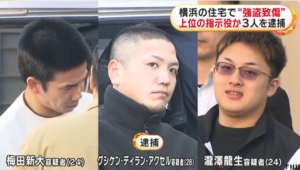 梅田新大容疑者(24)とアルゼンチン国籍のグシケン・ディラン・アクセル容疑者(28)、瀧澤龍生容疑者(24)ら3人は、去年7月、横浜市神奈川区の住宅に侵入し、住人の60代男性に催涙スプレーのようなものを吹きかけるなどしてけがをさせ、現金およそ700万円が入った金庫を奪った疑いが持たれています。