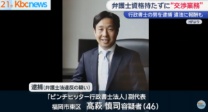 福岡市東区の「ピンチヒッター行政書士法人」副代表で行政書士の高萩慎司容疑者(46)が自賠責保険の請求手続きを行ったとして弁護士法違反の容疑で逮捕されました。