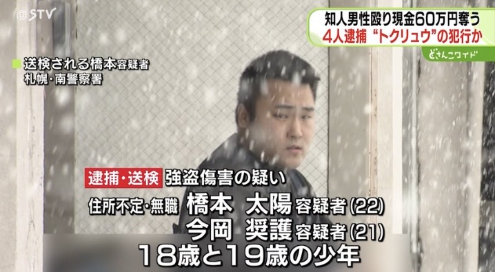 逮捕・監禁と傷害の疑いで逮捕されたのは、住所不定・無職の今岡奨護容疑者(21)と同じく橋本太陽容疑者(22)、札幌市南区の会社員の鈴木麻日容疑者(21)、札幌市南区の解体業の斎藤慶太朗容疑者(21)、札幌市東区の建築業の植田龍之介容疑者(21)と、札幌市内に住む無職の19歳の男の合わせて6人です。