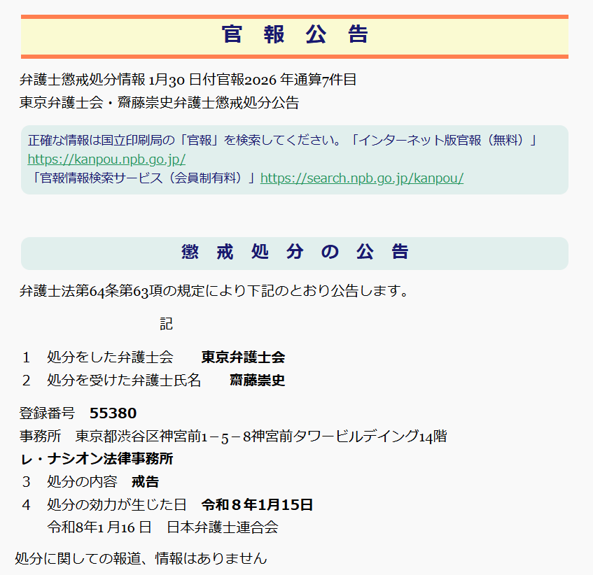 Z李さんの闇金会社の顧問弁護士の斎藤崇史弁護士の懲戒請求が通る