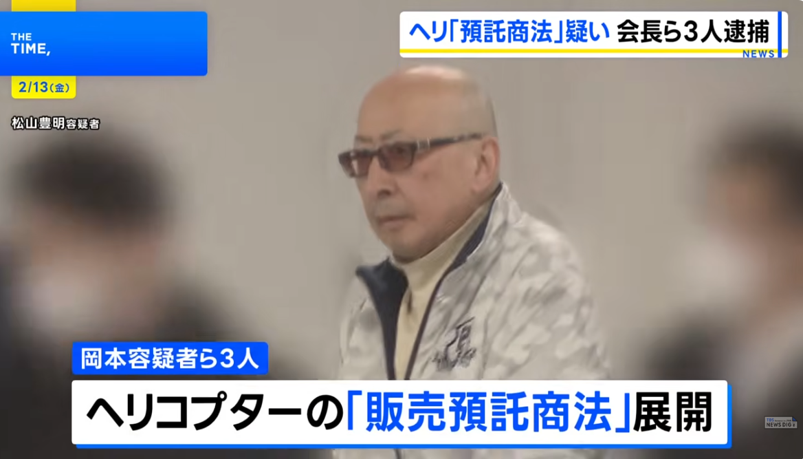 ヘリコプターを共同で所有すれば毎月配当を得られるとうたう販売預託商法を行ったとして、警視庁は預託法違反の疑いで、航空関連事業を行う一般社団法人「S.I.Net会」会長の岡本智文容疑者(61)とグループ会社「エスアイヘリシス」代表の山本学容疑者(56)と松山豊明容疑者ら3人を逮捕した。
