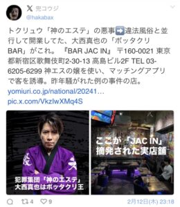 他にもこのグループは神のエステの女の子を使ってマッチングアプリで男性をバーに誘い出して高額な料金をぼったくっていたと指摘されています。
