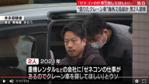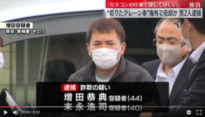 増田恭典と末永浩司ら2人がクレーン車を騙し取ったとして逮捕。