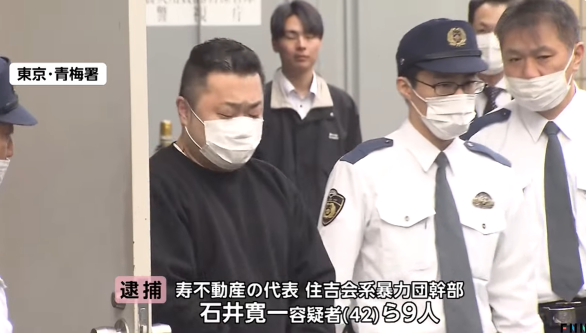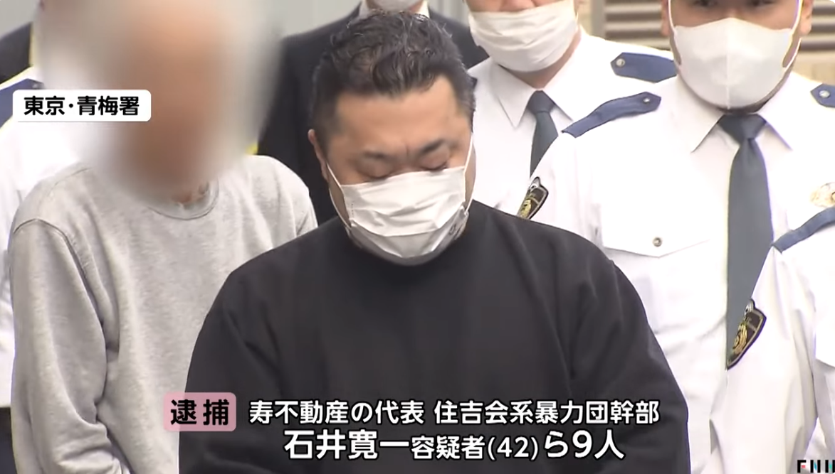 寿不動産代表で住吉会幸平一家加藤連合会聡仁組幹部の石井寛一と会社役員の臼居崇ら9人が不動産を高額で売りつけて現金を騙し取ったとして逮捕。