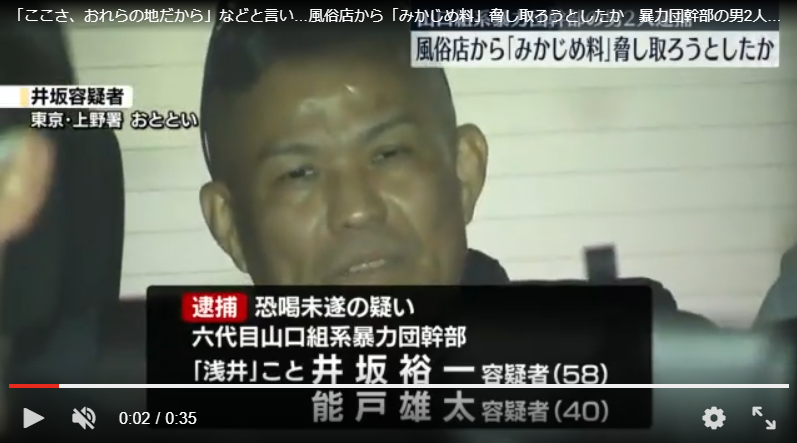 山口組国粋会前川一家本部長の浅井裕一こと井坂裕一と能戸雄太が台東区の風俗店経営者からみかじめ料を脅し取ったとして逮捕。