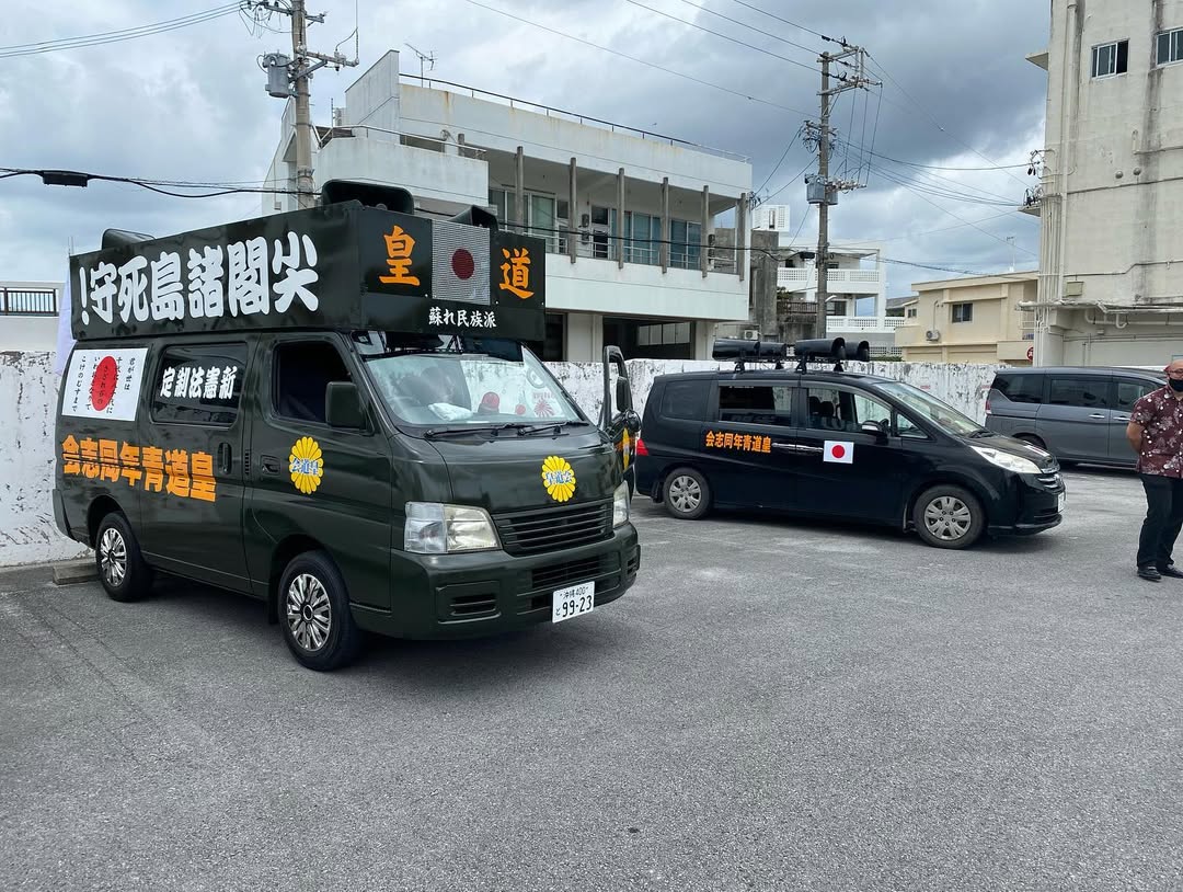 組織的犯罪処罰法違反などの疑いで逮捕・送検されたのは、南風原町津嘉山の右翼団体「皇道青年同志会」代表の久保玉井謙清容疑者(27)と元妻で保育助手の大城杏奈容疑者(28)と配達員の島袋優人容疑者(27)です。