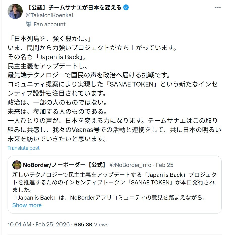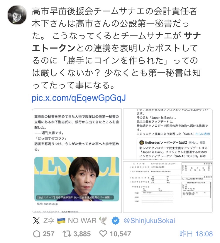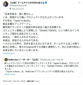 高市早苗総理の後援会は仮想通貨サナエトークンとの連携を大々的に表明していました。