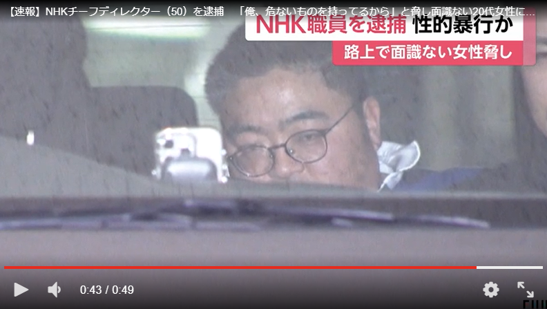 NHK報道局スポーツセンタースポーツ情報番組部のチーフディレクターの中元健介が面識のない女性に性的暴行を加えたとして逮捕。