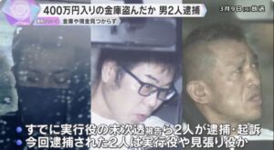 会社事務所に侵入して、現金約400万円が入った金庫を盗んだとして、実行役と見張り役とみられる男2人が逮捕されました。