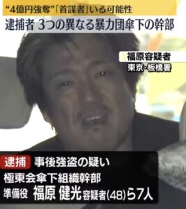 事後強盗の疑いで逮捕されたのは、住居不詳の山口組弘道会福島連合張本組幹部の狩野仁琉容疑者(21)、住居・職業不詳の小池恒児容疑者(47)、千葉県茂原市・職業不詳の村田亜怜容疑者(27)、千葉県九十九里町粟生の住吉会幸平一家義勇会幹部の伊藤雄飛容疑者(27)、千葉県一宮町・職業不詳の池田大樹容疑者(34)、板橋区熊野町の極東会系幹部の福原健光容疑者(48)、台東区・職業不詳の池田裕介容疑者(33)です。