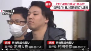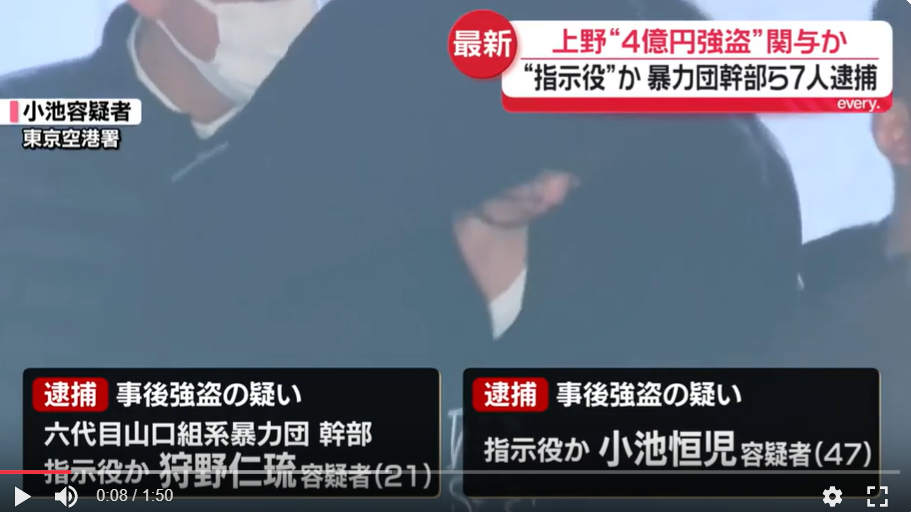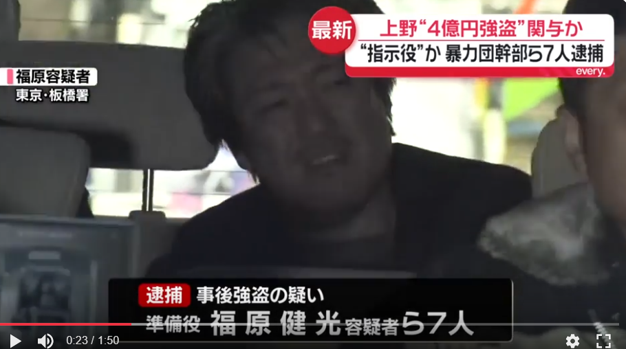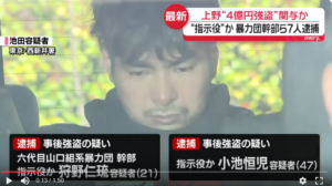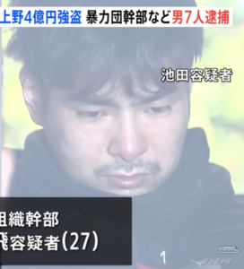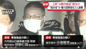 山口組弘道会小澤組幹部の狩野仁琉と住吉会幸平一家義勇会幹部の伊藤雄飛と極東会系幹部の福原健光ら7人が上野で両替商の男性を襲い4億円を奪ったとして逮捕。