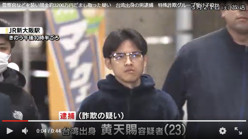 詐欺の疑いで逮捕された台湾出身の黄天賜容疑者(23)は、去年12月、他のメンバーと共謀し、大阪市内の男性(70代)に警察官などを装って電話をかけ、「詐欺グループのリーダーとして疑っている。 資金洗浄が必要で現金を持参しなければ逮捕する」などとウソを言い、現金約3200万円をだまし取った疑いがもたれています。