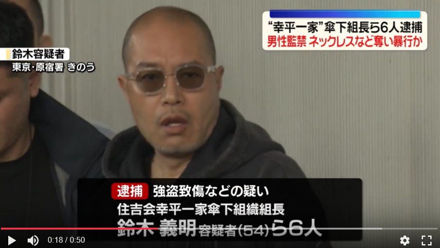 住吉会幸平一家鈴木組組長の鈴木義明ら6人を監禁と強盗致傷の容疑で逮捕。