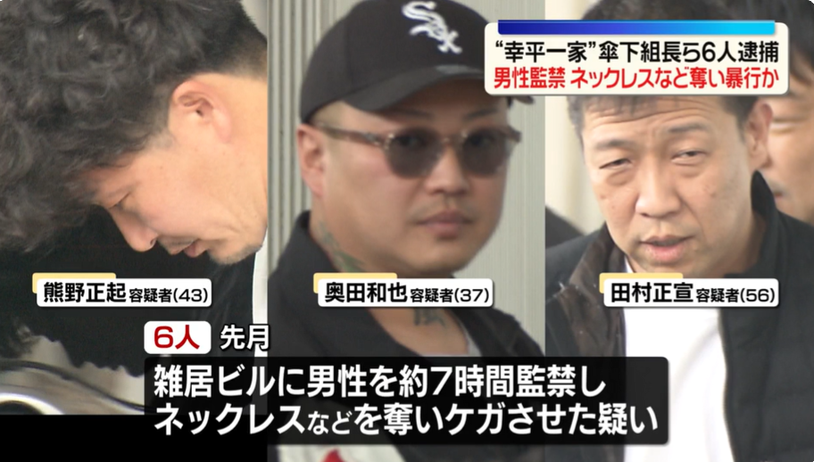 住吉会幸平一家鈴木組組長の鈴木義明容疑者(54)=豊島区西池袋=と鈴木組幹部の田村正宣容疑者(56)=埼玉県志木市館=と組員の奥田和也容疑者(37)と組員の熊野正起容疑者(43)と組員の三井隆将容疑者(34)と組員の木村広希容疑者(34)ら6人は2月、東京・池袋にあるビルの一室で、鈴木組幹部の40代の男性をおよそ7時間にわたって監禁して暴行を加え、ネックレスなど90万円相当を奪った疑いがもたれています。