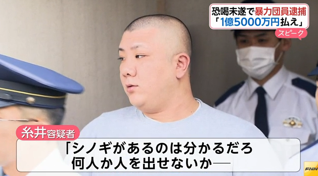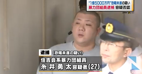 住吉会田中同人会組員の糸井勇太が1億5000万円を脅し取ろうとしたとして逮捕