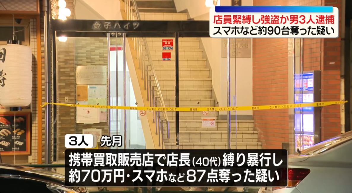 携帯電話販売店の店長を縛り上げてけがをさせ、現金や携帯電話などを奪った疑いで男3人が逮捕されました。